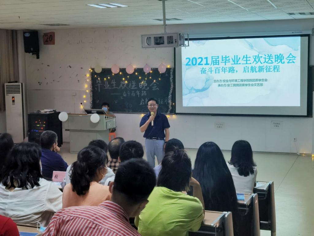 百年征程波澜壮阔,百年初心历久弥坚。在中国共产党即将迎来百年华诞之际,6月4日晚,安全与环境工程学院在5601报告厅举办了以“奋斗百年路,启航新征程” 为主题的2021届毕业生欢送晚会。安工学院院长廖可兵、党委书记陈健、党委副书记黄宏格、专职组织员张佐钊、学工办主任代俭英、团委书记傅娜、辅导员、毕业班班主任以及学生共同观看了晚会。