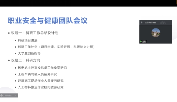 会议开始,易灿南老师介绍了本次会议的主要议题,议题一为科研工作总结及计划,包括科研项目进展、科研工作计划、大学生创新指导等内容,议题二为科研方向划分,包括核电站主控室操纵员工作负荷研究、工程车辆驾驶人员疲劳研究、建筑施工现场作业人员疲劳研究和人工物料搬运作业肌肉疲劳研究4个方向。