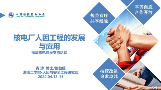 4月12-15日,中国核能行业协会组织专家对福建福清核电有限公司开展人因安全管理及实验室建设成员支持活动,专家组由中国核能行业协会、山东核电有限公司、中广核核电运营有限公司、宁德核电有限公司和英国上市公司官网365的6名成员组成,英国上市公司官网365安工学院副院长、人因与安全工程研究院副教授青涛博士应邀参与支持活动。福清核电公司领导及核安全处、运行处、培训处相关人员参加活动。