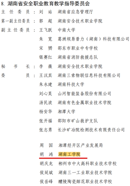 近期,湖南省教育厅公布了我省首批行业职业教育教学指导委员会(简称“行指委”)组成人员名单。我院胡鸿教授入选为湖南省安全职业教育教学指导委员会委员。