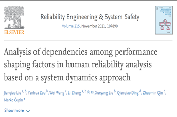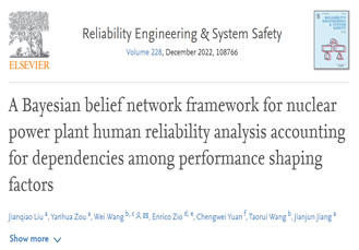 人因与安全工程研究院刘建桥博士在国际顶级期刊《Reliability Engineering & System Safety》上以第一作者连续发表2篇研究论文。《Reliability Engineering & System Safety》由爱思唯尔和欧洲安全与可靠性协会联合出版,是国际可靠性与安全领域的顶级期刊,在2021年12月最新中科院分区中属于1区Top期刊,JCR分区为Q1。刘建桥博士发表于2021年6月的论文《Analysis of dependencies among performance shaping factors in human reliability analysis based on a system dynamics approach》主要采用了系统动力学、互信息理论、层次分析法等研究了核电厂主控室操纵员行为形成因子之间的因果关系问题;发表于2022年8月的论文《A Bayesian belief network framework for nuclear power plant human reliability analysis accounting for dependencies among performance shaping factors》在前一研究的基础上,主要采用了贝叶斯网络、探索性因子分析、以及蒙特卡洛方法探究了行为形成因子之间交互关系的不确定性问题。