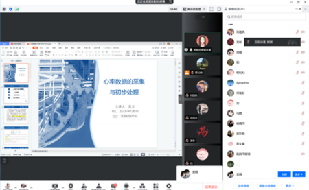 培训开始,易灿南老师主持会议,对培训的内容做了简单的说明后,吴文老师对心率数据产生的原理以及心率数据的测量采集、处理、分析进行了详细全面的讲解,对数据分析过程中可能产生的问题进行了说明。