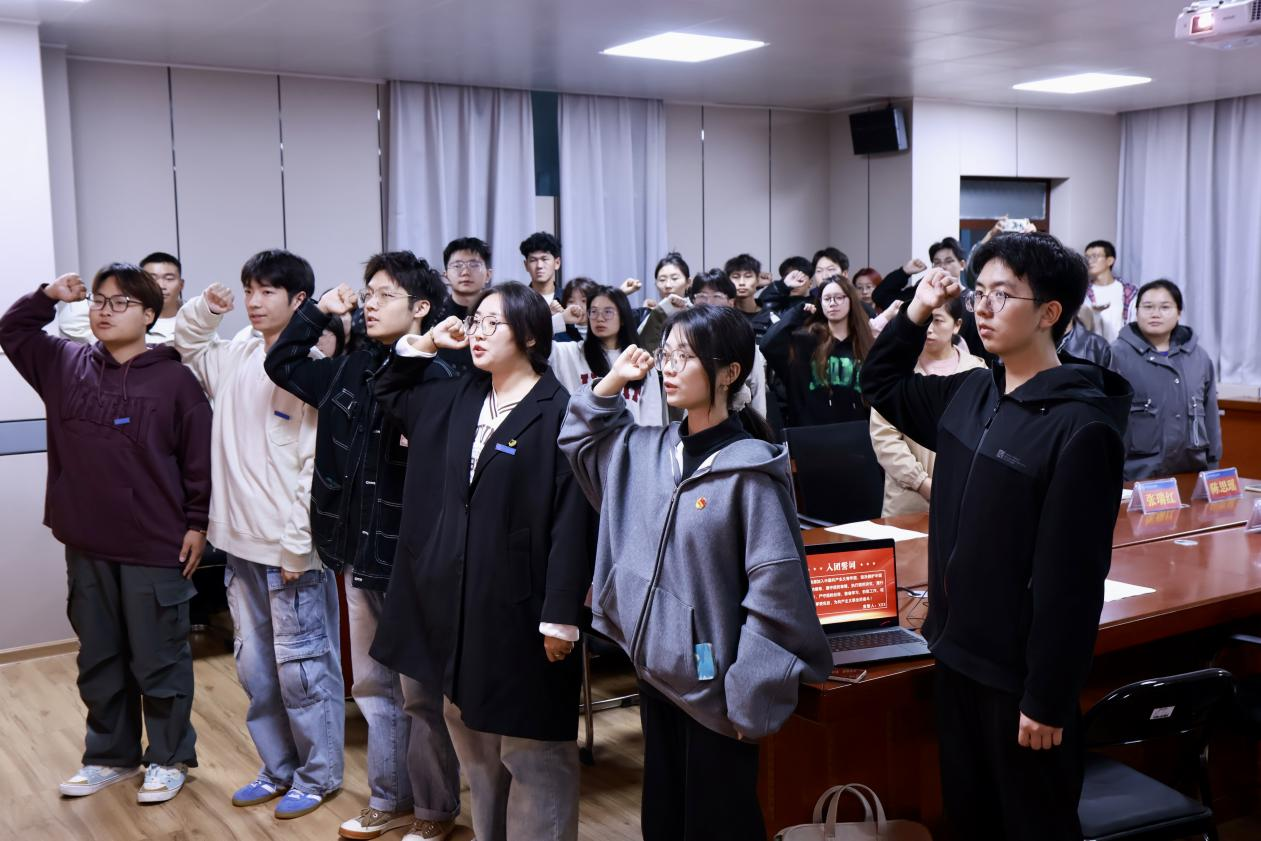 学工办主任兼分团委书记蒋昂松宣读了新团员名单。全体辅导员为新团员颁发团员证和团徽。在老团员的带领下,新团员们面向团旗,紧握右拳,跟随老团员一字一句地重温了入团誓词