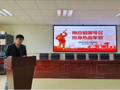 2022年11月24日至25日,材料科学与工程学院于材化楼1301分年级专业全覆盖开展2023年征兵宣讲部署会。党委书记刘湘欣,院长罗建新,副书记金燕,学工办主任李前奔、全体辅导员出席大会,征兵专干冯志敏主持会议。