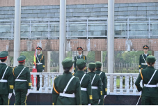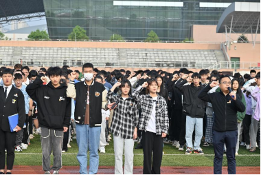升旗仪式开始,伴随庄严的乐曲,国旗护卫队精神抖擞,迎着清晨的第一缕阳光,踏着铿锵有力的步伐护送国旗至升旗台上。当雄伟庄严的国歌奏响,五星红旗冉冉升起、迎风飘扬,全体师生肃穆而立,向国旗行注目礼。