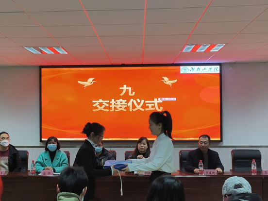 第十四届学生会轮值主席沈赞与十五届团委学生副书记金冰艺进行交接,金冰艺作就职报告,新一届主席团成员带领全体学生干部进行入职宣誓。