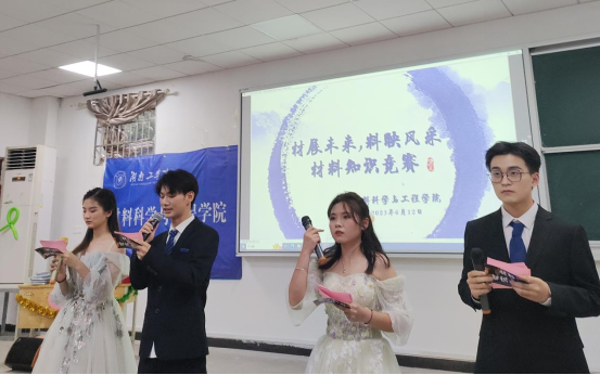 6月12日,材料科学与工程学院在建工楼6106开展2023年“材展未来,料映风采”材料知识竞赛决赛,学院党委书记刘赢时、院长罗建新、副书记金燕、副院长黄建平、副院长吴智出席大赛,学工办主任李前奔、辅导员邓佩然、王安东和100余名同学观看比赛。