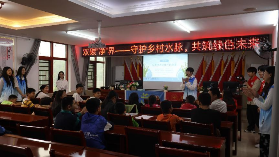 双碳“净”界分队振兴村的儿童开展水知识科普宣讲。分队成员黄洪举讲述了如何整合专业知识和高校平台开发了新型高效双碳净水剂,重点讲述了抗生素,以及抗生素这把双刃剑是如何治病救人、又如何给我们带来隐性危害演示了净水剂如何对污水进行治理生动有趣的讲解、互动答题和实验操作让孩子们兴趣盎然让孩子体会了材料的魅力,提高了孩子们对保护水资源的意识。