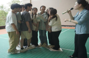 讲座结束后,心理专家谢玲带领40余名同学在材化楼3楼阳台开展团体辅导活动。“你喂我吃”活动要求遮住眼睛给队友递吃香蕉,“同舟共济”活动把一张布当成大海的一条船,每组团体成员必须同时站在船上,一个也不能少,并持续将布面积减半。两个活动充分地培养了学生心、脑、手的默契,让学生感受到了团队合作的力量。
