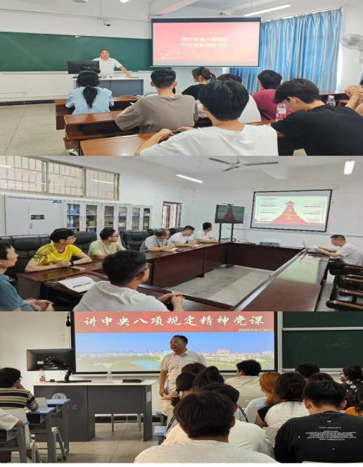 其他党委成员以“严守纪律规矩 强化责任担当”为核心,结合学院实际工作与党员岗位职责给教职工党员、学生党员讲党课。各主讲人从中央八项规定的出台背景、核心要义及实践要求切入,通过政策解读、案例分析与互动问答等形式,重点阐释了“厉行节约、反对浪费”“密切联系群众”“规范公务行为”等具体要求,并结合近年来高校系统内的典型案例,警示党员干部时刻保持政治清醒,严守纪律红线。