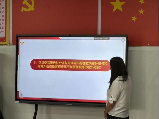开展“你问我答”知识比赛:比赛通过“你问我答”的形式进行,由提问者念题并当场宣布正确与否。比赛共分8组,每组3道题,对《条例》中的内容进行随机提问,所有参赛选手面对《条例》知识问题,都有条不紊地给出了正确答案,全体党员在比赛活动中进一步加深了对《条例》理解,进一步增强了学习《条例》的行动自觉。