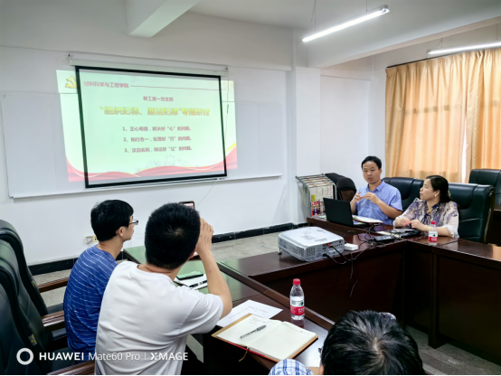 聆听纪律党课:学院党委书记刘赢时、支部联系领导娄晓明参加本次微党课活动。刘赢时以组织纪律为重点内容进行了微党课授课。娄晓明“严格执行党的纪律,确保党和国家事业长盛不衰”主题,详细讲述了《中国共产党纪律处分条例》修订前后变化情况。他强调,当前,学校正处于改革攻坚、爬坡过坎的关键时期。本学期学校更是发布了2024年十大重点任务,其中有申硕、学科建设、高分子专业工程认证、产业学院、成果转化、横向进账等重头戏。这需要我们党员领导干部充分解放思想、严格党的纪律、冲锋在前,为学校的高质量发展出自己最大的贡献!