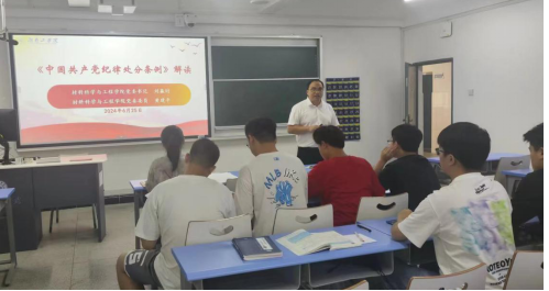 为进一步增强党员“学党纪、知党纪、明党纪、守党纪”的意识,6月26日下午,材料科学与工程学院组织全体学生党员在1404开展《中国共产党纪律处分条例》专题学习研讨暨“一月一课一片一实践”主题党日活动。
