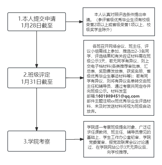 (一)本人提交申请。2024年1月28日前,本人认真对照评选条件提出申请。(参评省级优秀毕业生须有校级荣誉2项以上或省级荣誉1项以上,校级奖学金除外)