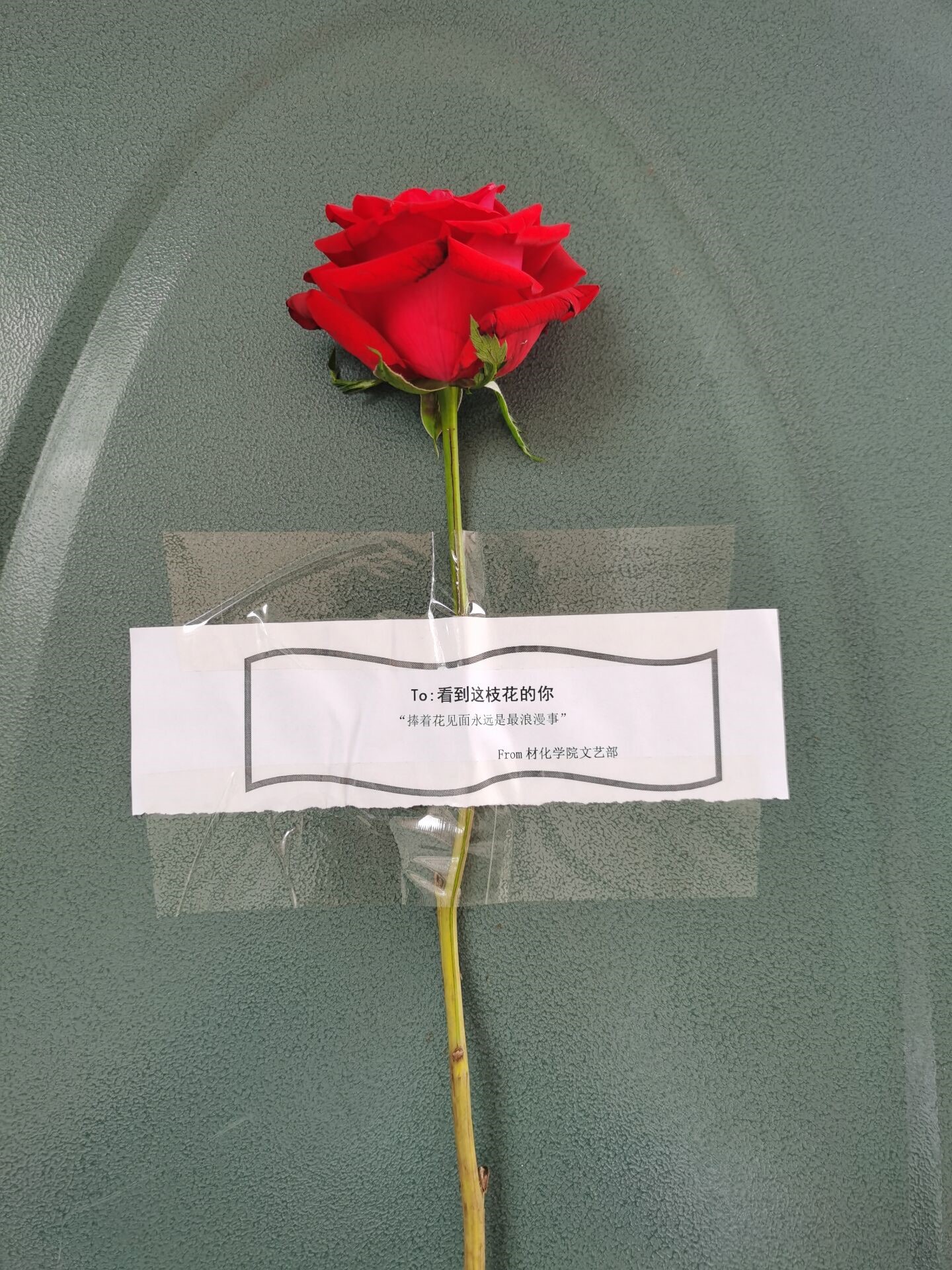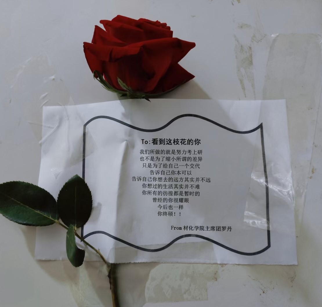 20210520日至0531日,材化学院团学会文艺部在材化楼一楼安排工作人员守候给学生免费发放玫瑰,让学生写下自己的祝福粘贴在玫瑰上,将玫瑰贴满材化楼。并且在大四宿舍楼下安置板报,让大四毕业生写下了自己想说的话,并将板报放置到材化楼一楼,让学弟学妹们将自己对毕业生们的祝福写在板报上。此次活动材化学院全体师生都加入其中,大家一起给毕业生们留祝福、赠寄语。