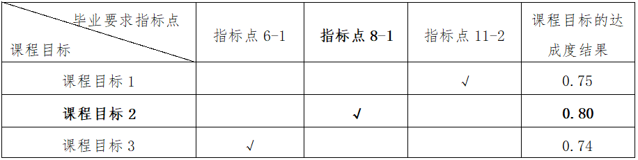 举例说明:指标点8-1、8-2各由三门课程支撑,课程A的课程目标2支撑指标点8-1,如表2所示,若计算得到课程A的课程目标2达成度为0.8,则课程A对应指标点8-1的达成度评价值为0.4×0.8=0.32, 同理可计算其他5门课程的达成度评价值,如表1所示,各课程达成度评价值求和,得到指标点达成度,继而得到毕业要求的达成度。