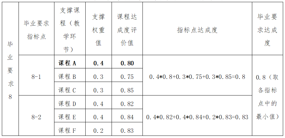 4)将课程目标达成度与相应的权重系数相乘,得到课程达成度评价值,将支撑某个毕业要求指标点的所有课程达成度评价值进行求和,即为该毕业要求指标点的达成度。取某一毕业要求所有指标点达成度的最小值,作为该毕业要求的达成度。