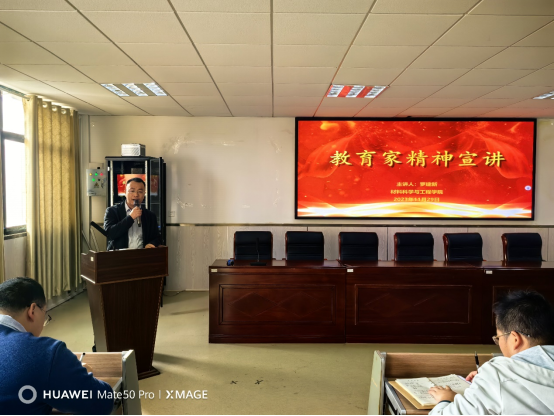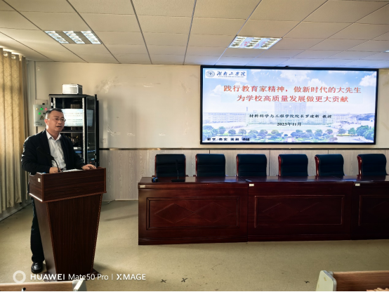 1129下午,为深入学习习近平总书记在致信全国优秀教师代表中所强调的教育家精神,巩固主题教育成果,推进学校高质量发展,材料科学与工程学院院长罗建新教授在材化楼1301践行教育家精神,做新时代的大先生,为学校高质量发展做更大贡献,向全院教职工作教育家精神专题宣讲。