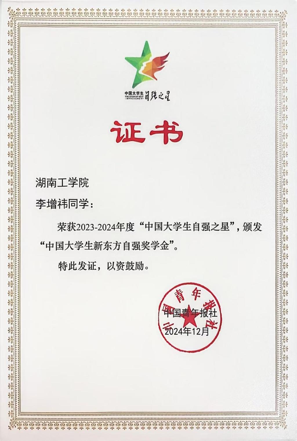 近日,2023-2024年度“中国大学生自强之星”奖学金推报活动的评选结果揭晓,我院李增祎同学获评2023-2024年度“中国大学生自强之星”,并获得“中国大学生新东方自强奖学金”。