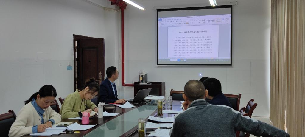 专题学习会上,张文玉院长首先对会议提出了要求,每位教师要认真学习,做好学习笔记,至少撰写一篇学习心得,然后依次带领大家学习了《湖南省师德师风教育读本》习近平总书记关于教育工作重要论述摘编、《中共中央国务院关于全面深化新时代教师队伍建设改革的意见》、《教育部严禁教师违规收受学生及家长礼品礼金等行为的规定(教监〔2014〕4号)》、《新时代高校教师职业行为十项准则》等师德师风必学内容,并对师德师风自学内容进行了安排。