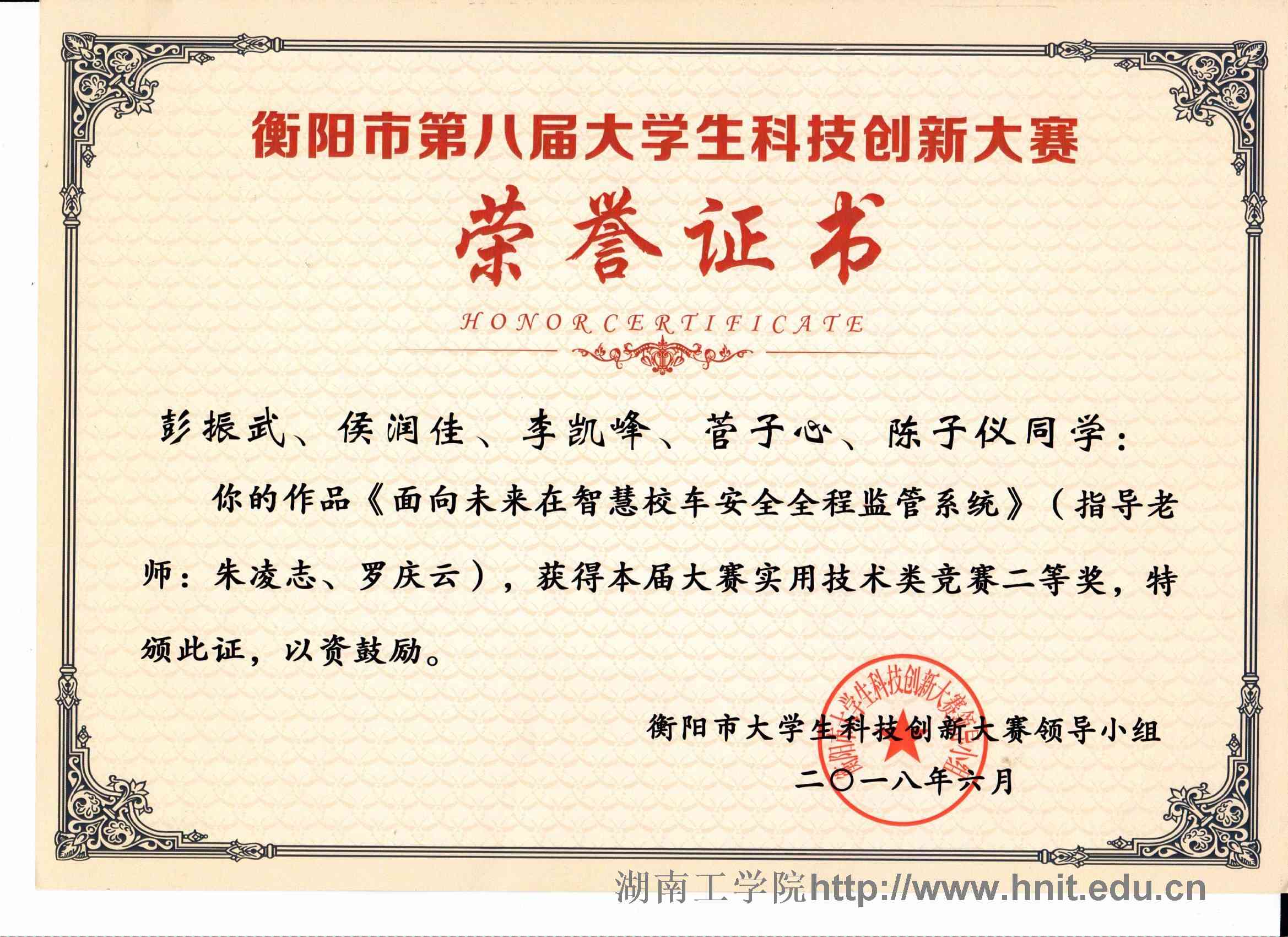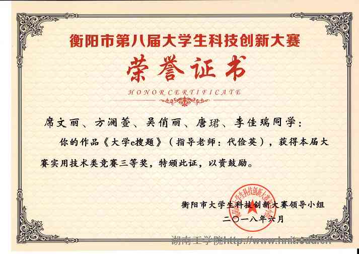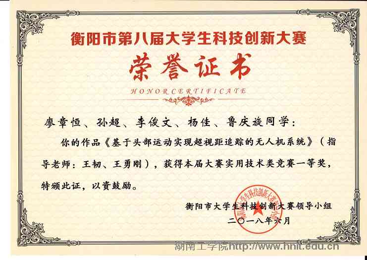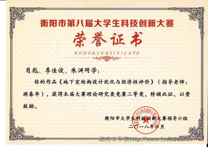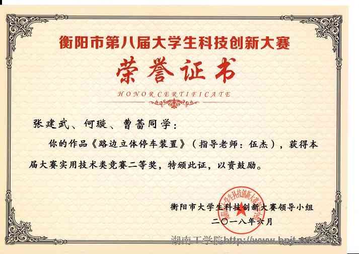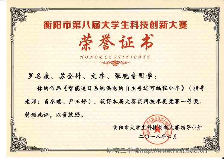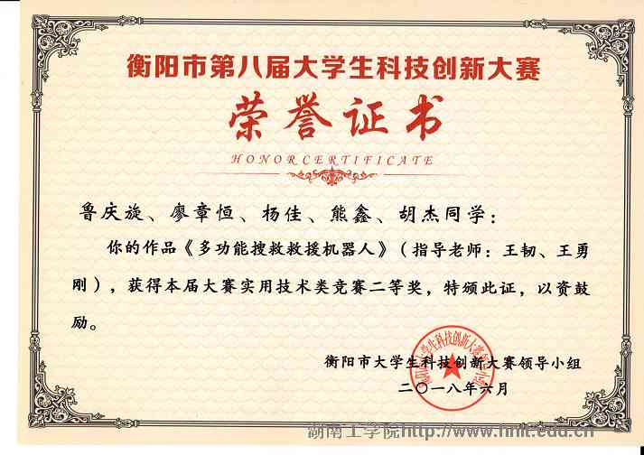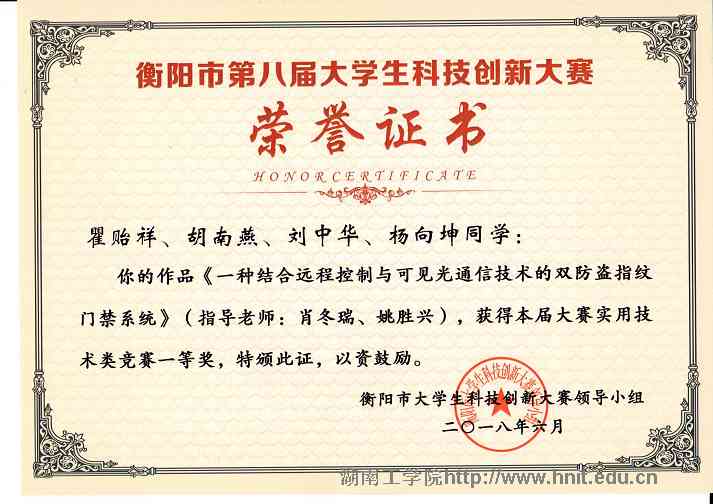 衡阳市第八届大学生科技创新大赛荣誉证书