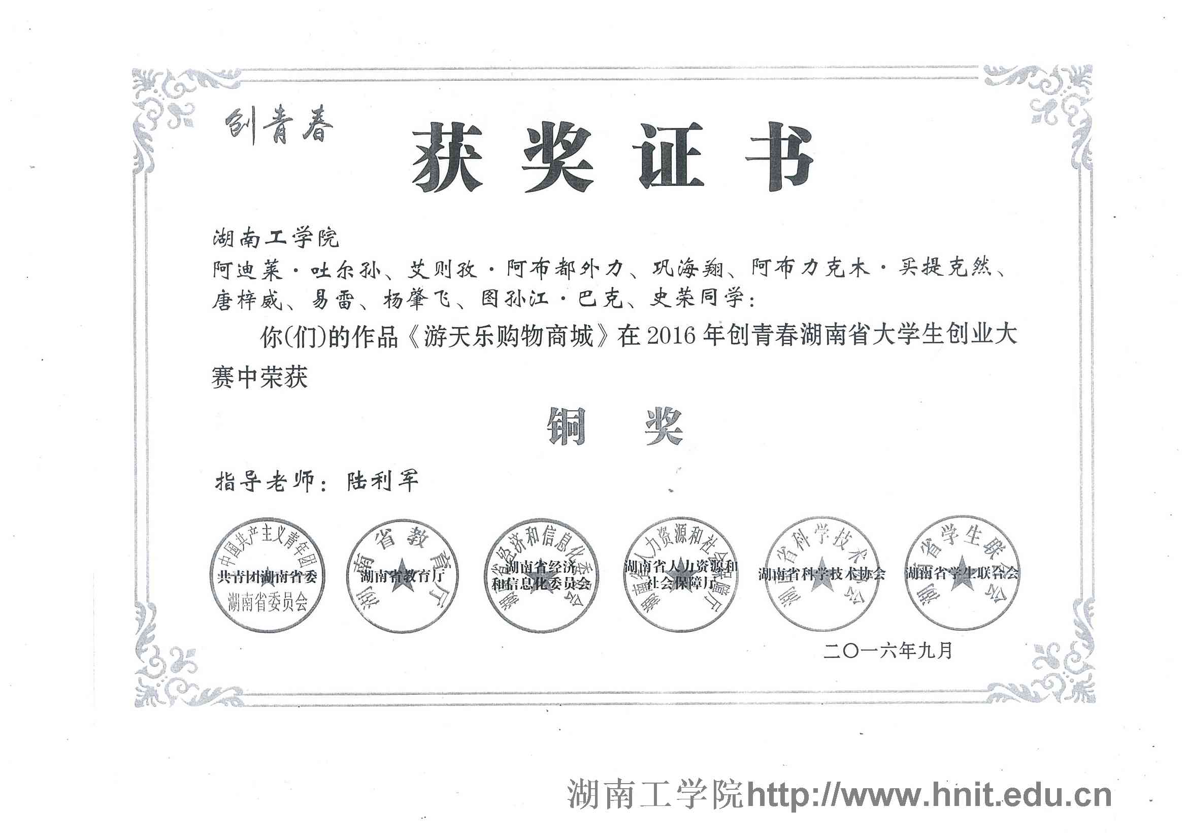 2016年创青春湖南省大学生创业大赛荣誉证书