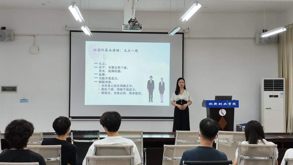 培训过程中,校内礼仪专家邹莉老师围绕路演时的仪表、仪态等内容展开了阐述;同时还和同学们进行互动,并现场对仪态中的站姿、蹲姿进行示范,使同学们对路演过程中的礼仪有了新的认知,了解到礼仪在路演展示过程中的重要性。
