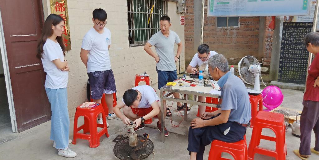 8月28日,按照事先计划,我们一早便来到枫井坪村村部,开展了义务维修活动。首先,队员们用广播让村民们将坏了的小型家电拿来我们这里维修,例如吹风机、电扇、小太阳等,每个人都非常尽力的为村民们解决问题,修好了很多电器,村民们更是觉得高兴,对我们连连称赞。