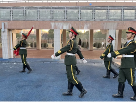 迎着朝阳,国旗护卫队成员迈着铿锵的步伐来到了国旗台下,全场一片肃静。在激昂的义勇军进行曲中,升旗手振臂一挥,鲜艳的五星红旗徐徐展开。全体师生的注目中,迎着初升的太阳,五星红旗在晨曦中迎风飘扬。