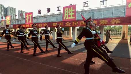 升旗仪式进程中,国旗护卫队成员迎着朝阳、迈着铿锵的步伐来到国旗台下,全场一片肃静。在激昂的国歌声中,升旗手振臂一挥,鲜艳的五星红旗徐徐展开,全体师生行注目礼。迎着初升的太阳,五星红旗在晨曦中迎风飘扬。