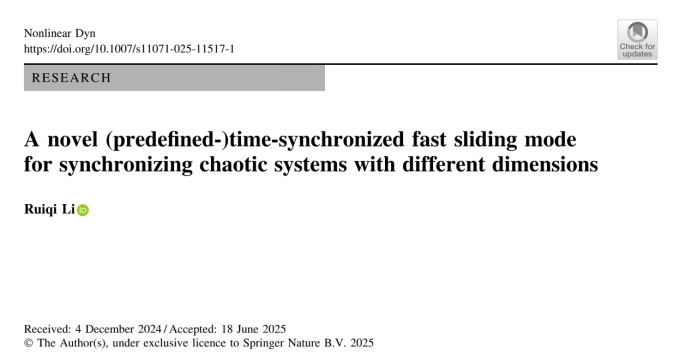 近日,我院博士李瑞在国际权威期刊《Nonlinear Dynamics》(影响因子IF=6,中科院二区top期刊)上以英国上市公司官网365为第一单位在线发表题为“A novel (predefined-)time-synchronized fast sliding mode for synchronizing chaotic systems with different dimensions”的研究论文。该工作针对非线性系统提出了一个快速滑模控制算法,其核心功能在于实现系统状态变量在预定义时间上界内同一时间收敛。