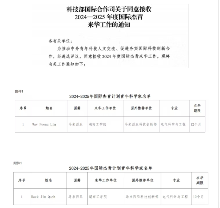 近日,科技部国际合作司公布了2024年度国际杰青计划项目评审结果。我院取得了在该类项目上的重大突破,共有两名专业外教成功入选,他们分别是来自马来西亚的博士Way Foong Lim、Hock Jin Quah。本次国际杰青项目获批填补了我院在该项目的空白。