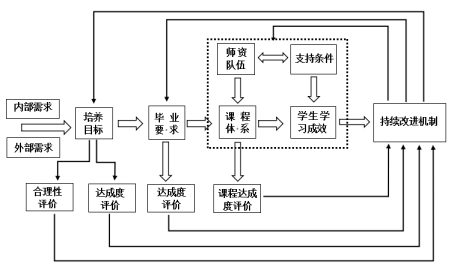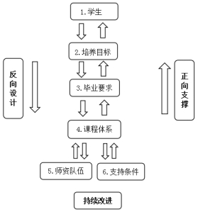 持续改进的主要内容有:专业人才培养目标、毕业要求、课程体系、师资队伍和支持条件,其支撑关系如图1所示 。