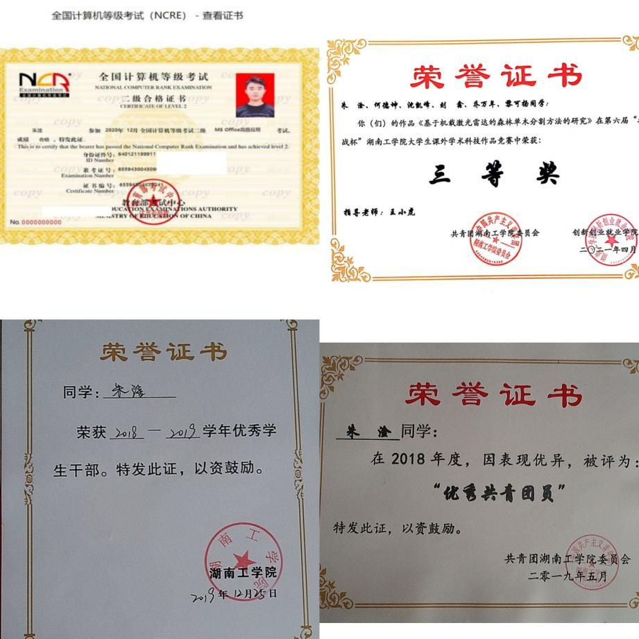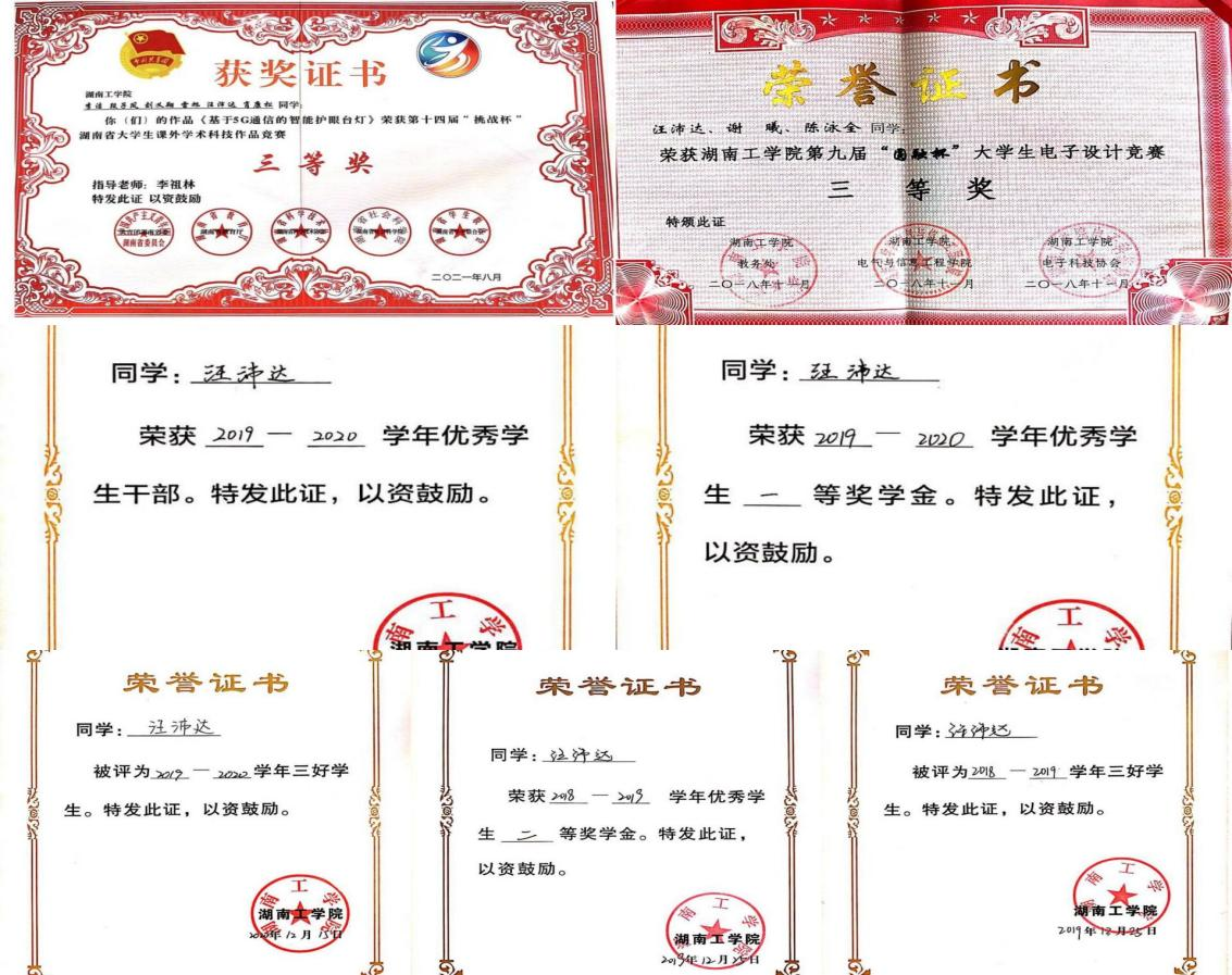 在校期间获得国家奖学金1次、国家励志奖学金2次、校一等奖学金3次、校优秀共青团干1次、校优秀共青团员2次、校优秀干部1次。此外,荣获湖南省挑战杯竞赛三等奖、校互联网+创新创业大赛一等奖、校电子商务大赛二等奖、校圆融杯电子设计大赛二等奖、院主持人大赛一等奖、院职业生涯规划大赛一等奖、院爱国主题征文比赛一等奖等奖项。通过自学获得大学英语六级、国家计算机二级等证书。
