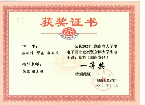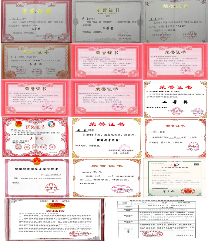 在校期间获国家励志奖学金、二等奖学金、三等奖学金、校优秀工作者、优秀学生干部;2020年国家级大学生创新创业项目负责人。曾积极参与并协助学院创新创业类比赛、电子竞赛等赛事,荣获2020年湖南省大学生电子竞赛三等奖;2021年全国大学生电子竞赛一等奖;校级“圆融杯”、“互联网+”竞赛等奖项;参加“三下乡”大学生社会实践活动。