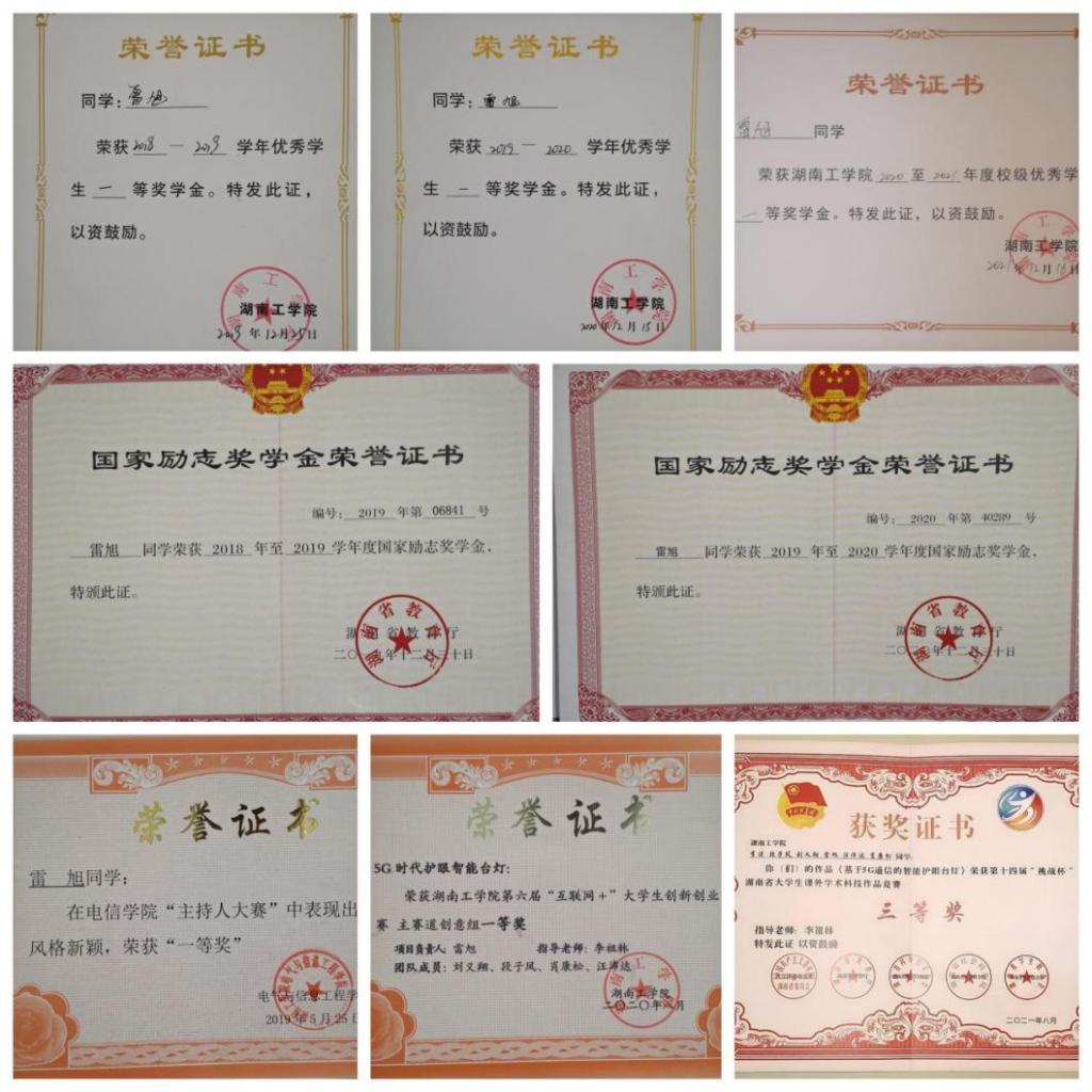 在校期间荣获一次学习成绩和综测均为班级第一,获国家励志奖学金、一等奖学金,二等奖学金、三等奖学金、优秀共青团员,优秀学生干部。