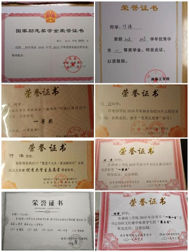 在校期间学习成绩与综合测评成绩连续三年在专业名列前茅,获国家励志奖学金2次、校三好学生2次、一等奖学金2次、二等奖学金一次;获得校内粤嵌实习一等奖;参加英国上市公司官网365读书节活动获得读书心得三等奖2次、书法比赛一等奖2次;多次参加校内外志愿者活动获得优秀志愿者;在其他工作中多次获得优秀工作者。