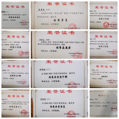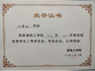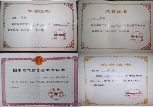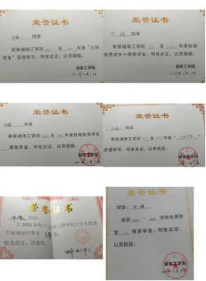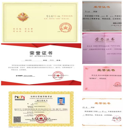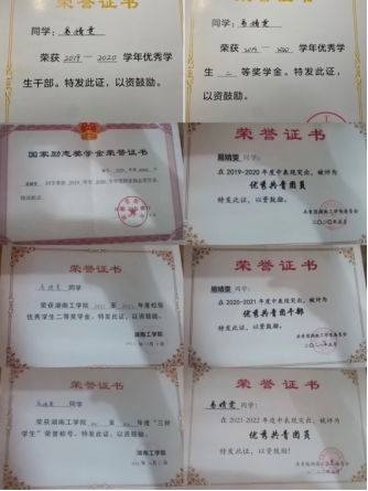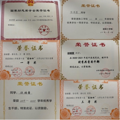 在校期间曾获国家励志奖学金、湖南省大学生电子设计竞赛三等奖、校级一等奖学金、校级三好学生、校级优秀共青团员、校“互联网+”创新创业竞赛二等奖、校“挑战杯”创业计划竞赛二等奖、校“圆融杯”电子设计竞赛二等奖等荣誉;曾获湖南省大学生创新创业项目立项,曾以第一作者在国家级期刊发表学术论文一篇,以第一著作权人获软件著作权一项,积极参加暑期“三下乡”大学生社会实践活动。