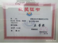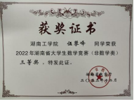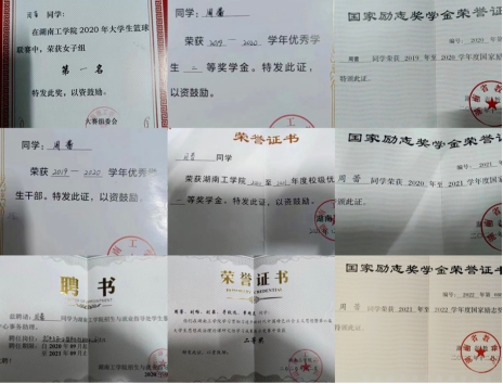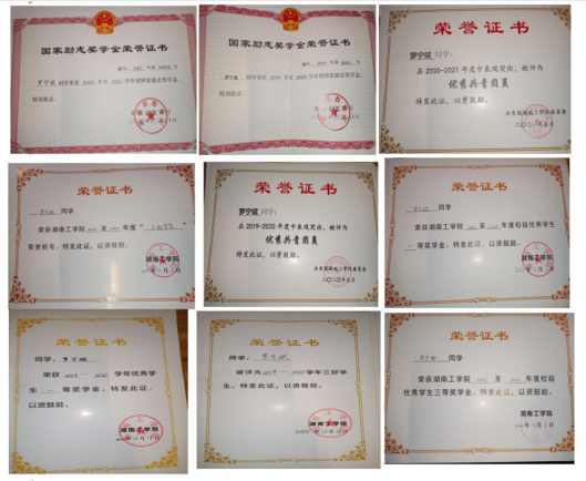 在校期间曾获国家励志奖学金、湖南省大学生数学竞赛三等奖、校级数学竞赛二等奖、“华教杯”全国大学生数学竞赛初赛三等奖、校级二等奖学金和三等奖学金、校级优秀共青团员。