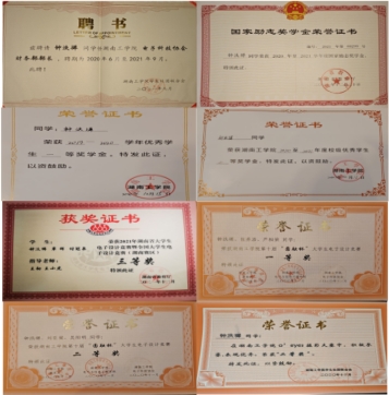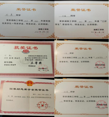 在校期间学习成绩和综测均名列前茅,曾获国家励志奖学金、校级一等奖学金两次、校级二等奖学金。积极参与电子设计竞赛,曾荣2021年全国大学生电子竞赛三等奖、“圆融杯”电子设计竞赛校级一等奖和二等奖、“互联网+”创新创业大赛校级三等奖,多次参加校内外志愿者活动获得优秀志愿者称号。