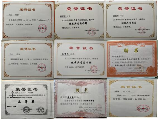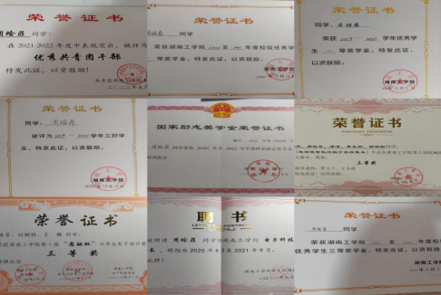 在校期间,曾获得国家励志奖学金、校级一等奖学金两次、校级三等奖学金、校级三好学生、校级优秀团干、校级优秀团员等;在课外生活中,曾多次参加社团活动及比赛,获得“圆融杯”电子设计竞赛校级三等奖、机械创新设计大赛校级三等奖。并在新生才艺大赛上获得最佳团体奖、最佳组织奖。