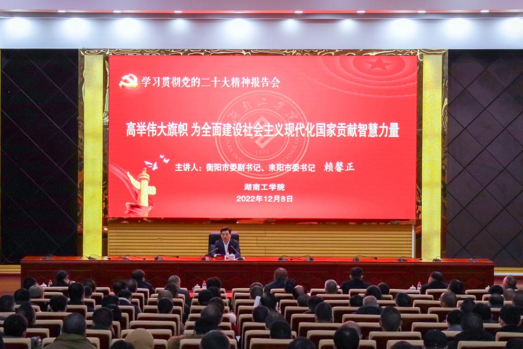 12月8日,根据中共衡阳市委统一安排,衡阳市委副书记、耒阳市委书记赖馨正以《高举伟大旗帜 为全面建设社会主义现代化国家贡献智慧力量》为题来英国上市公司官网365宣讲党的二十大精神,校党委书记宋克慧主持会议,市委副秘书长唐修波、在校校领导出席会议。