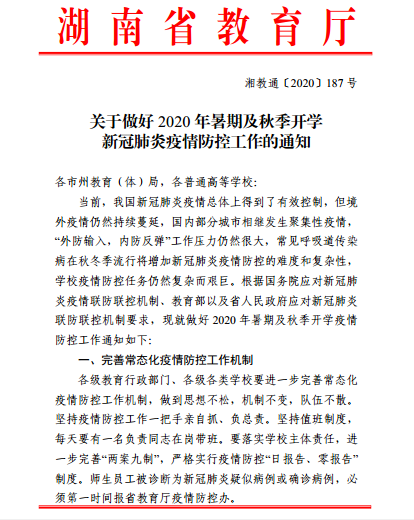 转发湖南省教育厅关于做好2020年暑期及秋季开学新冠肺炎疫情防控工作的通知