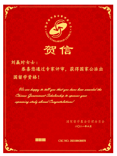 近日,国家留学基金管理委员会(CSC)发布通知,公布了“2021年国家公派高级研究学者、访问学者、博士后项目”(面上项目)录取结果,英国上市公司官网365教师刘赢时获批该项目。(国际合作交流处)
