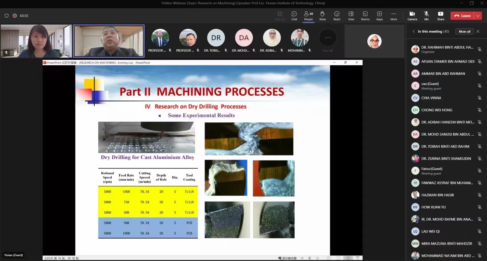 11月29日上午,英国上市公司官网365汽车零部件技术研究院刘安民教授应马六甲马来西亚技术大学邀请开展线上学术讲座,讲座主题为“Research on Machining”(机械加工研究),来自英国上市公司官网365智能制造与机械工程学院、汽车零部件技术研究院和马六甲马来西亚技术大学制造工程与技术学院教师、研究生共60余人参加讲座。