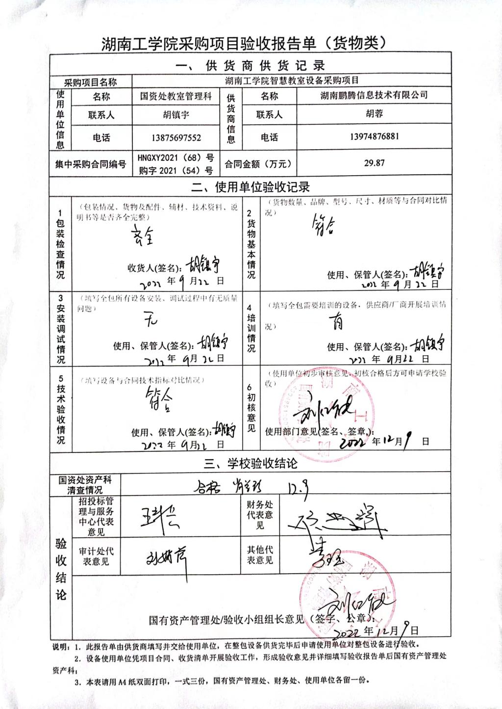 2022年12月关于HNGXY2022【68】号 购字2022【54】号采购项目验收情况公告