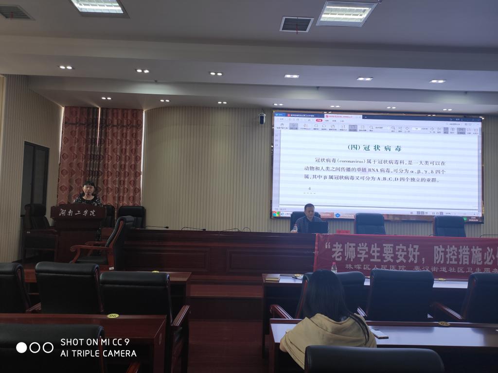 本次培训由后勤处副处长王金银主持,主讲人是珠晖区疾控中心的雷克平副主任医师,雷主任从事传染病防控工作35年,他利用PPT课件,结合自己的防控实践,以图文并茂的形式介绍了新冠肺炎的病因、临床表现、传染途径、疫情报告与处置、通风消毒方法和学校复学复课的常态化防控等相关知识。参加本次讲座的有各二级学院副书记、学工办主任、各职能处室的信息员同志共计50余人。医务人员为全体学员分发了新冠肺炎防控手册等宣传资料。