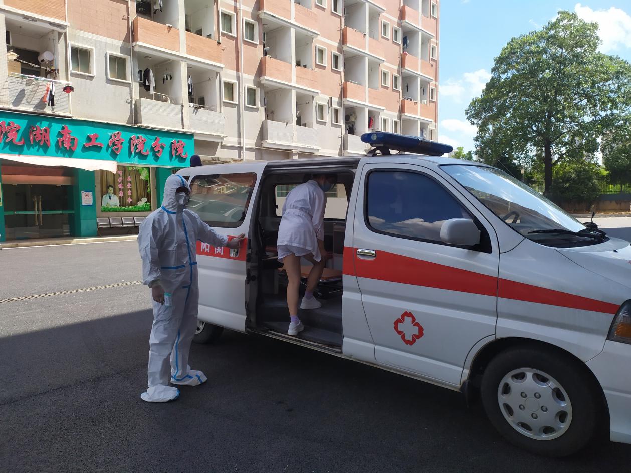 本次模拟演练发热人员应急处置场景项目。学生返校后,在寝室晨检时“发现”一名学生体温≥37.3℃,然后报告辅导员,立即由辅导员引导“发热学生”至校医院发热专区进行体温复测,经复测后体温仍≥37.3℃,现场医生询问学生行动活动轨迹,开展流行病学史相关调查,进行核酸检测,完成处置后,将学生留在学校临时隔离区进行管控。学生核酸检测结果出现异常后,立即按规定程序逐级报告,根据指示启动应急预案,紧急安排专车送入定点医院隔离治疗等多个场景。同时,校医院安排人员对“发热学生”路径轨迹进行规范消杀。