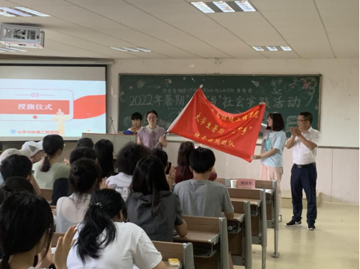 蔡玲宣读了参加暑期“三下乡”社会实践活动的团队名单,周立为暑期“三下乡”社会实践重点团队授旗。全体参与社会实践活动的同学进行社会实践志愿者宣誓,学生代表胡重阳进行个人发言,他鼓励大家不忘初心,不怕困难,坚定信念,积极投身社会实践,在实践中锻炼成才。