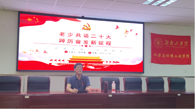 626日下午化学与环境工程学院在1301开展以“老少共话二十大,踔厉奋发新征程”为主题的“读懂中国”主题教育活动。活动由学院关心下一代工作委员会分会组织邀请了原校后勤处处长、退休教师彭轩雁做主讲人,学院党委副书记蔡玲、辅导员冯智发、学生代表60余人参加此次活动。